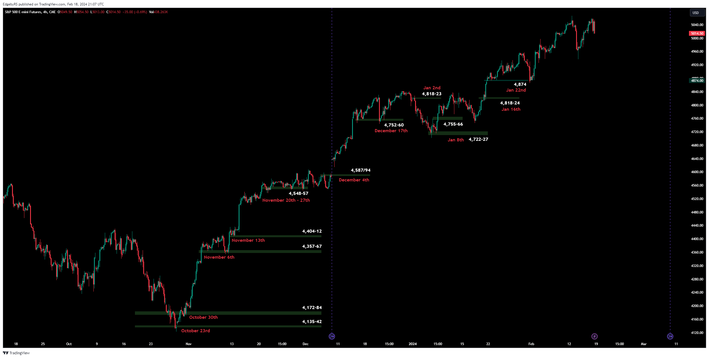 The ongoing uptrend from the October lows at 4,125 to last week's peak at 5,067 has resulted in ‘Shock n Awe’ to many market participants. This is primarily rooted in the fact that ES had been range-bound for two years, and psychological influences played a significant role. In contrast, we relied on our time-tested elements to stay on the right side of the market. It prompts us to question the merit of a strategy or model that advocates continuously shorting a rally that consistently achieves all-time highs every week.